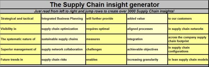 No need to worry anymore. The supply chain insight generator is the solution for you. You’ll never have to be quiet again. Just read from left to right and jump rows as you wish to generate the most wonderful supply chain insight. It’s time to get back at all those smart guys!
