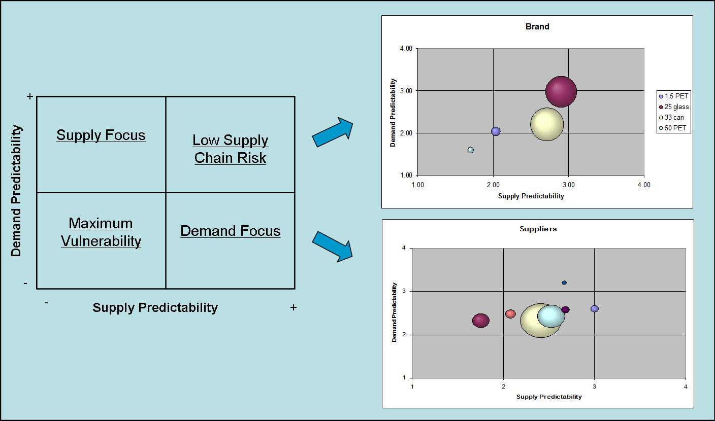 This can be done by product/source combination. It is important to agree criteria cross functionally, so when change is implemented after the analysis, there is no arguing on the data. Once scores are available on this level of detail they can be grouped to brand or vendor level. The picture shows two real examples of supply and demand predictability, mapped for a beverage brand and seven suppliers. The size of the bubbles can show volume or margin to assess a combination of risk and volume or value impact