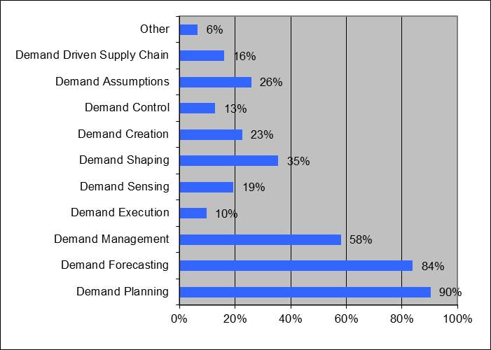 1. Traditional terminology is still key: Demand Planning (90%), Demand Management (58%) and Demand Forecasting (84%) are the most used terminologies by far by the participants. This was no surprise to me. The bigger question maybe is what everybody means with these terms.