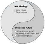According to Collins and Porras a company vision exists from its core values, core purpuse, a BHAG (big, hairy, audacious goal) and a vivid description. The core purpose is the reason for being; it captures the soul of the organization. Where you can fulfil a strategy, you can’t fulfil a purpose. Core values define what the company stands for. A company will stick to them, even if it became a competitive disadvantage in certain situations.