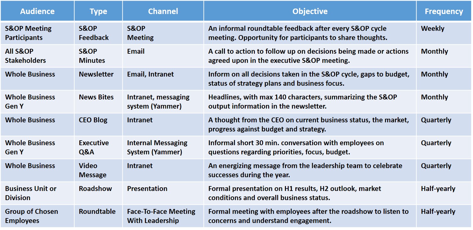 S&OP is going to be a long journey. So plan your communication along the way and make a conscious attempt to show people how the S&OP process and behaviours have helped improved visibility and company performance. Team up with HR and provide monthly S&OP key messages as output of the executive S&OP meeting, conduct S&OP roadshows, S&OP roundtables or S&OP toolbox meetings. Most important, share your S&OP wins on service levels, working capital, asset utilization, projected cash flows or earnings accuracy or any measure that’s important for your business and can be related to S&OP. You can start with below communication model, that I described in my Foresight article An S&OP communication plan: The Final Step in Support of Company Strategy.