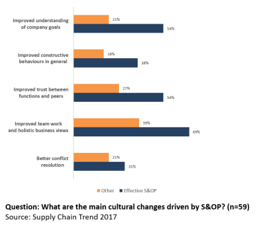 My S&OP pulse check indicates that participants in effective S&OP processes, see significant more proof of trust, teamwork, constructive behaviours and understanding of company goals. See below graph.
