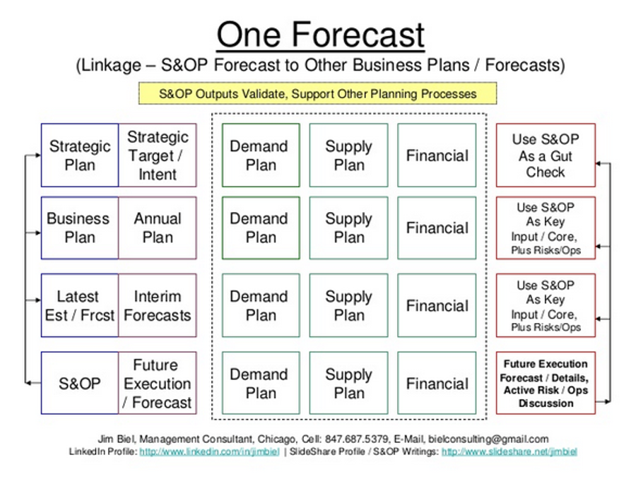 Jim: This is a classic process, system, people, metrics opportunity/challenge. One can make S&OP the core anchor process how a business plans, manages, executes, measures themselves. If you don’t adopt the core principles that S&OP defines, how else do you / should you run and manage a business? What else is there? All types of businesses can adopt much of the core principles espoused by S&OP, even hyper-perishable businesses, and service related businesses. There may be a very short-term need to be hyper-reactive for some businesses, but all businesses have some elements and a need to look at the long view of the business over a 12, 18, 24, 36 month time horizon, which is where S&OP can excel. Also, S&OP can be viewed, utilized and leveraged as the primary way a business plans and forecasts their business, including the quarterly re-forecasts, the annual operating plan, all the way through to the strategic planning process. Use the monthly rolling forecast output from S&OP as the basis for these various forecasting and planning time frames.
