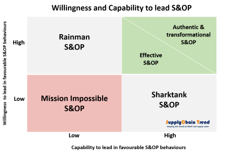 Different levels of leadership willingness and capability to support favourable S&OP behaviours, result in different types of S&OP. With the five elements from Tuomikangas & Kaipia in place and a critical mass of executive leaders with the capability and willingness to lead in favourable S&OP behaviours, effective S&OP can be established over time. Without executive willingness and capability, effective S&OP is a mission impossible, even with Tom Cruise as S&OP leader.