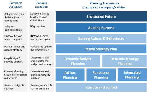 Based on the the 1996 HBR article from Collins and Porrass, I developed an integrated planning framework, which I describe in detail in this blog. The framework can be used to incorporate your S&OP purpose/meaning and include guiding values and behaviours. It further provides some S&OP maturity references to move from functional planning to dynamic strategy planning.