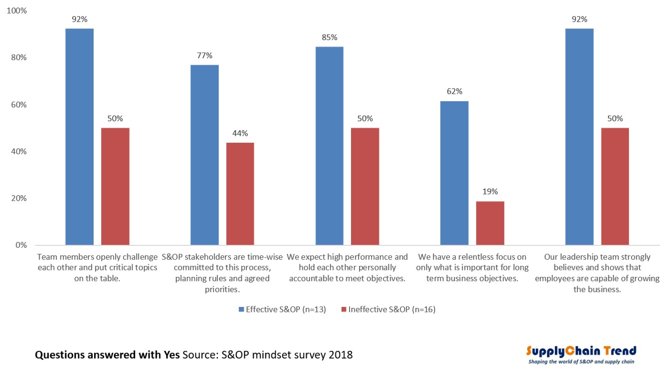 92% of survey participants with self proclaimed effective S&OP processes answered yes to the question; ‘Team members openly challenge each other and put critical topics on the table.’ Versus 50% for ineffective S&OP. Open challenge and discussion of critical topics is a sign of a psychological safe and trusted group environment, where people don’t feel theathened to speak up. This environment, which ineffective S&OP is less likely to have, improves the decision-making process, team effectiveness and employee well-being.