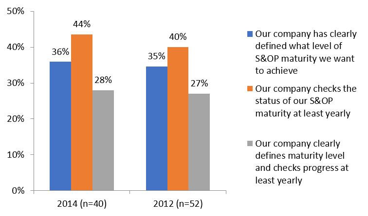 Goals need measurements and targets, and these need to be checked at least yearly to assess progress toward reaching desired maturity levels. However, in a recent survey (Figure 1) in which I asked practitioners—about three-quarters of whom were managers or directors— about their S&OP vision, only about one-third reported having clearly defined S&OP maturity levels, and only 28% both set targets and checked those yearly (Van Hove, 2014).