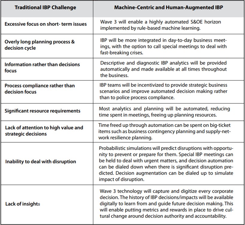 The traditional IBP process and supporting Waves 1 and 2 planning technologies are a generation old and incapable of effectively adapting to today’s challenges or taking advantage of innovations in technology. Long overdue is a reset of traditional processes to approach IBP from a decision perspective. Supported with today’s systems of intelligence, we can assess where the machine should automate decisions and where the human will guide the machine and lead in decision making. We can then integrate IBP into day-to-day business meetings, rather than maintain it as a separate planning process.