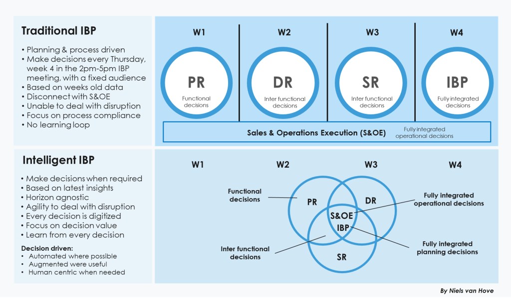 This will create an Intelligent IBP, centered around decisions, where decisions are being made when required, not when the process dictates. Where decisions are digitized so the enterprise can learn from every decision made. Where an IBP team is incentivized to increase decision value rather than policing IBP process compliance.