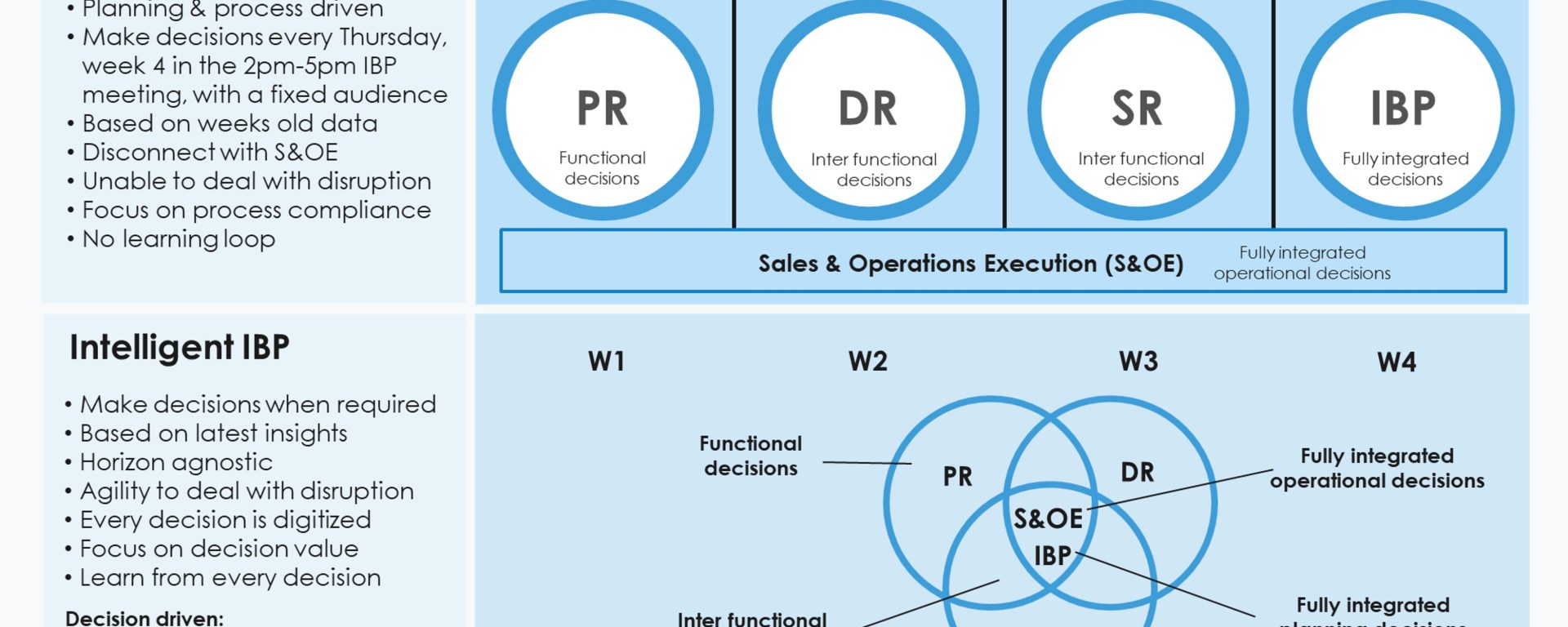 This will create an Intelligent IBP, centered around decisions, where decisions are being made when required, not when the process dictates. Where decisions are digitized so the enterprise can learn from every decision made. Where an IBP team is incentivized to increase decision value rather than policing IBP process compliance.