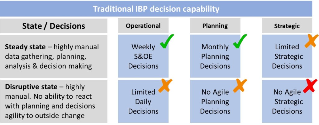 Due to the lack of a planner’s time and the focus on the information role, even in a reasonable steady business state, traditional monthly IBP facilitates limited strategic decisions making. In a state of disruption, the rigid weekly and monthly processes will struggle not only with strategic decisions, but also with more agile daily operational or weekly planning decisions.