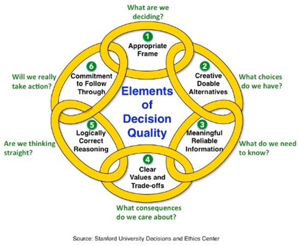 A decision quality framework is proposed in detail in the book Decision Quality. Below figure shows the framework with six proposed elements of decision quality. You can find detailed explanainations here.