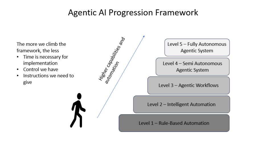 Edit: With the rise of agentic-AI, we need to differentiate between decision automation and decision (and action) autonomy. Rule based, or Intelligent automation seeks to automate existing or re-designed decision workflows. These automated flows are not necessarily autonomous, orchestrating, self-directing, self-learning & self-adjusting. Fully autonomous decision agents and agent-teams are. They just require a goal and boundaries and will make decisions, take action and learn autonomously. With the help of LLM’s they can take on the role of multiple planners to nreason, egotiate and solve more complex decisions. I describe examples of autonomous planning agent teams in my blog: The evolution of demand planning: augmentation and AI-agents (2025). Pascal Bornet uses the below AI agents progression framework in his book Agentic Artificial Intelligence.