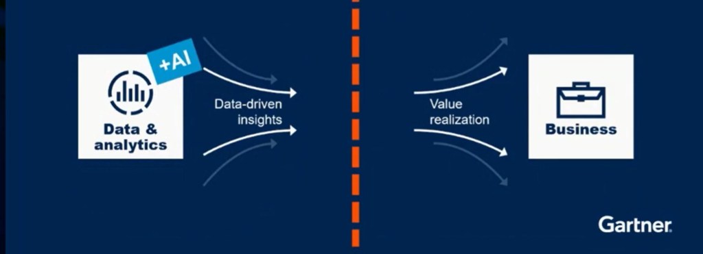 I called this the “Decision Gap” in a recent webinar. A week later I noticed that David Pidsley from Gartner called it the “Decision Divide” in his webinar. I pictured it as a dramatic canyon that one (or actually a whole business) has to overcome. Gartner shows it a bit more elegantly with a red dotted line as a divide between data driven insights and Value Realization.