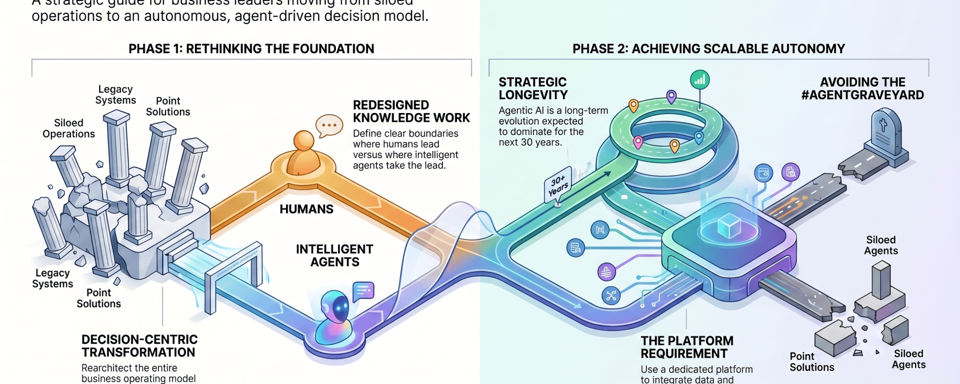 👉It’s a platform transition: to make the transformation highlighted in the first three steps, in a global business, at scale, integrated with a complex multi-layered legacy stack, you require a dedicated platform. A platform that has data integration, decisions, agents, learning and human engagement at its core. Some of the world largest, and most AI-focused companies have tried to build Agents bottom up from scratch and did not succeed in scaling. Many point solution agents build in the next few years, siloed, with vibe coding, will look beautiful, but can’t be scaled and also end on the #Agentgraveyard.